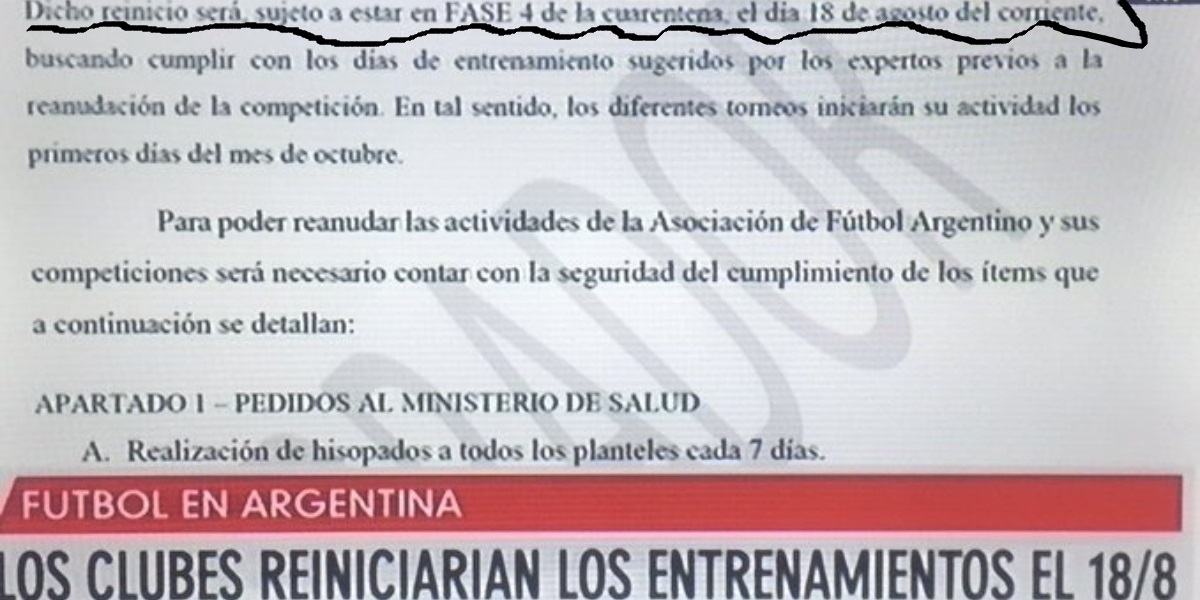 La noticia consigna que se filtró un borrador por parte de la Asociación del Fútbol Argentino (AFA), en el que se informa que los clubes volverán a los entrenamientos el próximo 18 de agosto.