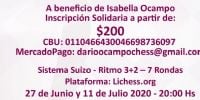 El Ajedrez Catamarqueño viene organizando un nuevo Torneo Online "TODOS POR ISABELLA OCAMPO", por Plataforma LiChess previsto para el 27 de Junio, a las 20:00 horas. Se repetirá el 11 de julio.