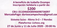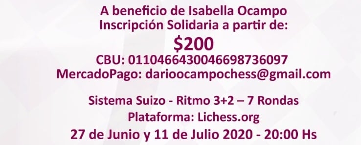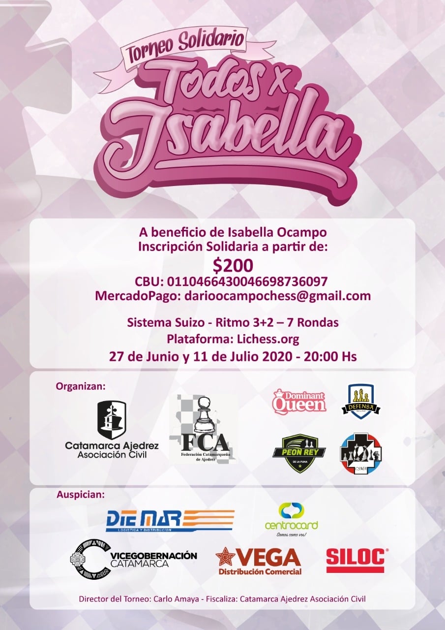 El Ajedrez Catamarqueño concretará este sábado 27 un nuevo Torneo Online "Todos por Isabella Ocampo", por Plataforma LiChess previsto para el 27 de Junio, a las 20:00 horas. Se repetirá el 11 de julio.