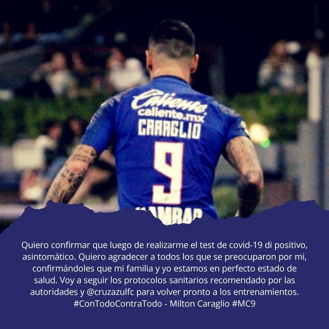 En ese sentido, este lunes se confirmó que Milton Caraglio, delantero rosarino que actualmente milita en la entidad mexicana, confirmó en su cuenta de Twitter que tiene COVID-19.