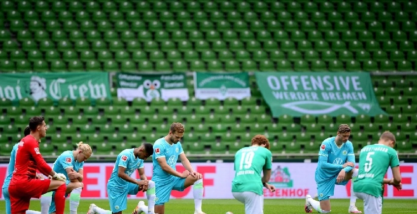 Antes de los partidos Werder Bremen-Wolsfburgo y Union Berlín-Schalke 04, válidos para la 30ma. jornada del campeonato, los jugadores, los árbitros y los entrenadores, posaron del mismo modo, con un gesto que había sido popularizado por el jugador de NFL (Liga de Football Americano), Colin Kaepernick, convertido en portavoz de las protestas en Estados Unidos contra la violencia policial, en particular contra las minorías de color.