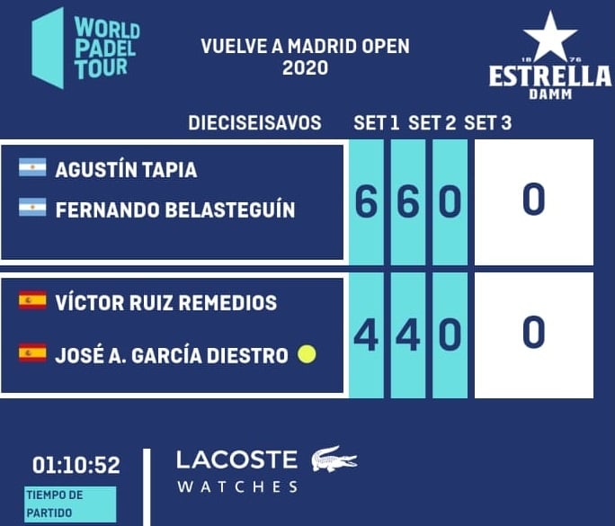 Junto a Fernando Belasteguín, Tapia logró una victoria muy seria por 6-4 / 6-4 frente a Víctor Ruiz y José Antonio García Diestro, en 1h10'52" de juego.
