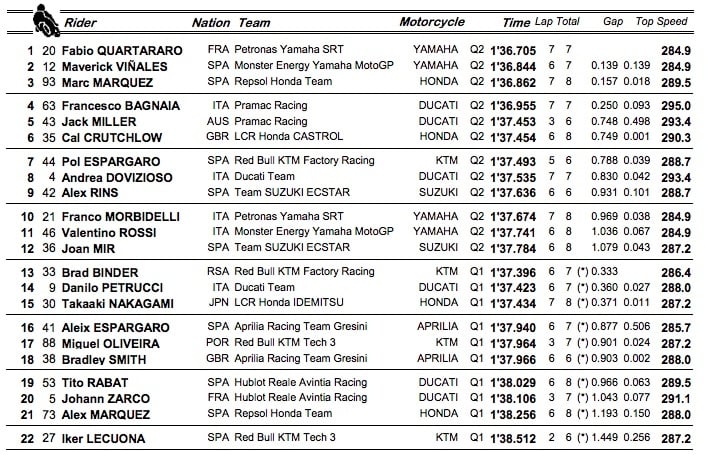 Llegó el día para MotoGP. Los pilotos de la categoría reina volvieron a saltar al ruedo en el circuito jerezano "Ángel Nieto" para competir por la pole position Márquez se presentó como el favorito indiscutible pero, como ocurrió el año pasado, Fabio Quartararo le robó la primera posición en un gran duelo y Maverick Viñales se coló en la fiesta en el último minuto con la segunda plaza.
