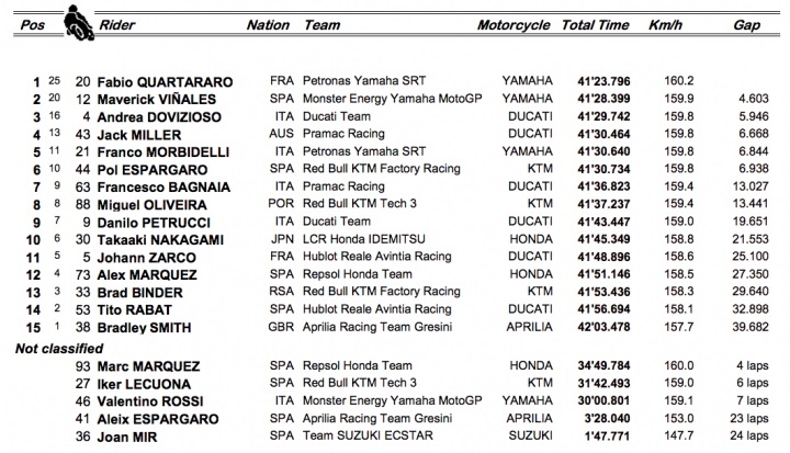 El "galo" ha hecho un fin de semana perfecto y su recompensa ha llegado a modo de victoria. Maverick ha sido segundo y Dovizioso tercero completando el podio. Márquez se accidentó y fue retirado en camilla por la sanidad de la prueba.