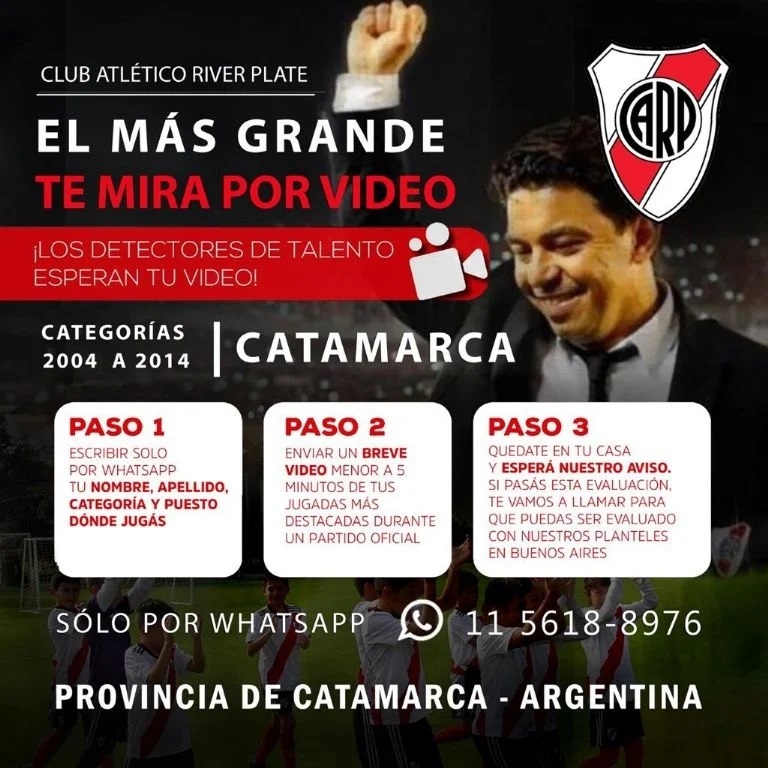 Paso 3: Los captadores oficiales de River, junto a Marcelo Gallardo, evaluarán y seleccionarán los mejores desempeños. Posteriormente, desde el Club Atlético River Plate, se comunicarán con los niños seleccionados, para un segunda prueba presencial, en Buenos Aires.