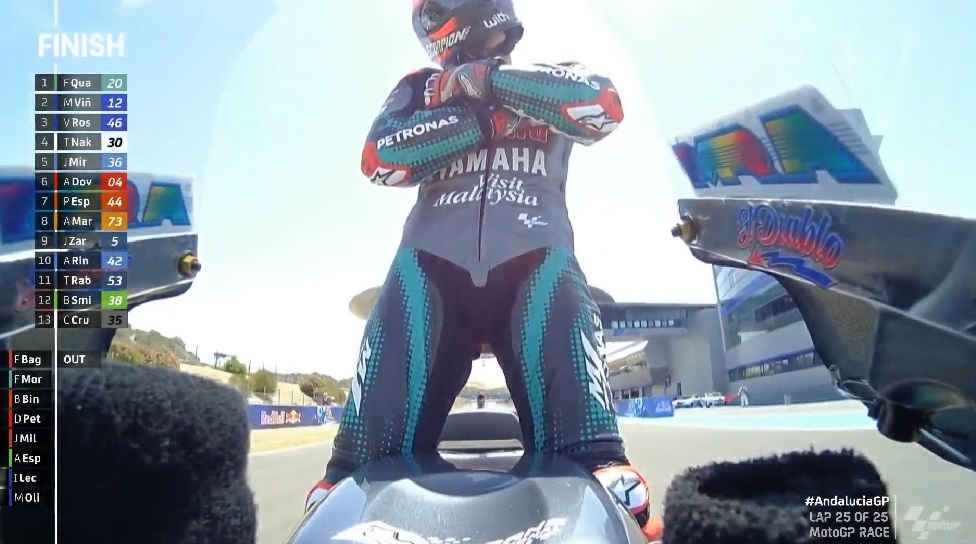 1º. Fabio Quartararo: "Ha sido muy duro, aunque he tenido buen ritmo. Mantenerlo era difícil, pero ha sido una carrera increíble. Gracias al equipo por su labor y a mi familia en casa. Me siento genial de conseguir estar segunda victoria consecutiva".