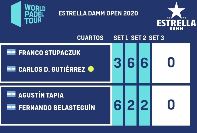 Los argentinos Franco Stupaczuk y Sanyo Gutiérrez dieron la vuelta a los 4tos. de final del Estrella Damm Open, prueba que retomó el World Pádel Tour tras la pandemia del coronavirus, que se celebra en el Madrid Arena, para imponerse a sus compatriotas Fernando Belasteguín y Agustín Tapia, que notaron más el óxido de tanto tiempo sin competir (22 errores no forzados).