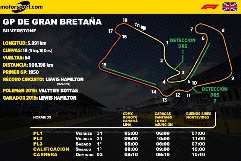 El Gran Premio de Gran Bretaña 2020 se ajusta al programa de las demás carreras europeas, pero su huso horario (allí es una hora menos) hace que alguna sesión cambie. Por ejemplo, los libres 1 y libres 2 son una hora más tarde de lo habitual, pero clasificación y carrera para los ingleses será una hora antes, de manera que en España.