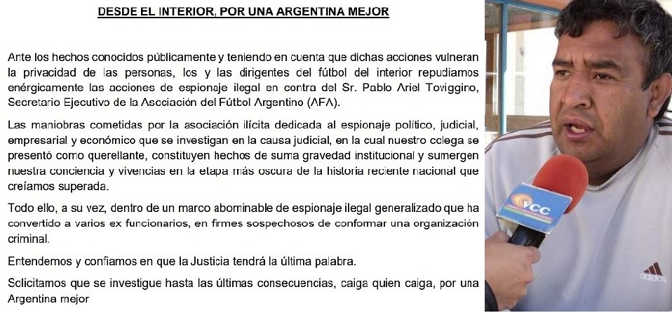 "Ante los hechos conocidos públicamente y teniendo en cuenta que dichas acciones vulneran la privacidad de las personas, los y las dirigentes del fútbol del interior repudiamos energicamente las acciones de espionaje ilegal en contra del Sr. Pablo Ariel Toviggino, Secretario Ejecutivo de la Asociación del Fúütbol Argentino (AFA).