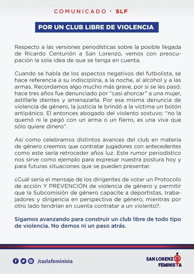 Antes del fin de semana, Racing tiene la intención de darle un destino a Ricardo Centurión, quien es buscado por varias instituciones de Argentina. Y en plena incertidumbre, se generó una situación incómoda para el futbolista pero también para un club que desea contratarlo. Aquí el documento de San Lorenzo Feminista.