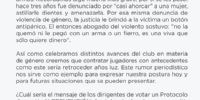 "Así como celebramos distintos avances del club en materia de género, creemos que contratar jugadores con antecedentes como este sería retroceder años luz (...). ¿Cual sería el mensaje de los dirigentes de votar un Protocolo de acción Y PREVENCIÓN de violencia de género y permitir que la Subcomisión de género capacite a deportistas, trabajadores y dirigencia en perspectiva de género, mientras por otro lado tendrían en cuenta contratar a un violento?", se preguntaron.