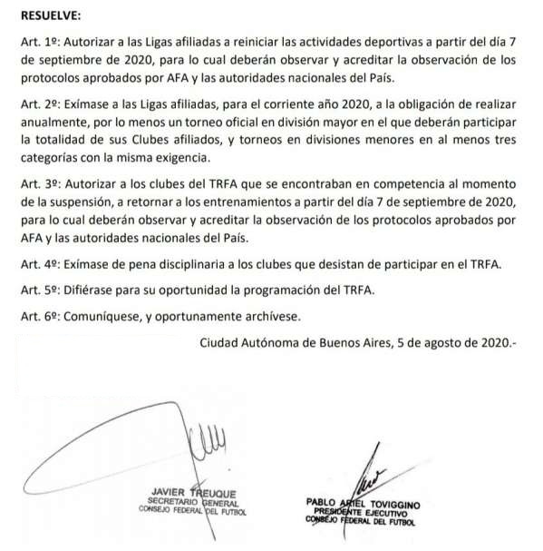 Y en el Art. 3ro. se "autoriza a los clubes del TRFA que se enocntraban en competencia al momento de la suspensión, a retomar los entrenamientos, a partir del día 7 de septiembre de 2020, para lo cual seberán observar y acreditar los protocolos aprobados por AFA y las autoridades nacionales".