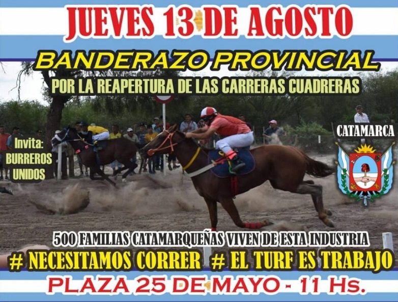 La movilización se concretará este jueves, 13 de agosto, a las 11 hs., en la Plaza 25 de Mayo de esta Capital, bajo las consignas "Necesitamo correr" y "El turf es trabajo", reclamando "la reapertura de las carreras cuadreras", y puntualizando que "500 familias catamarqueñas viven de esta industria" del turf.