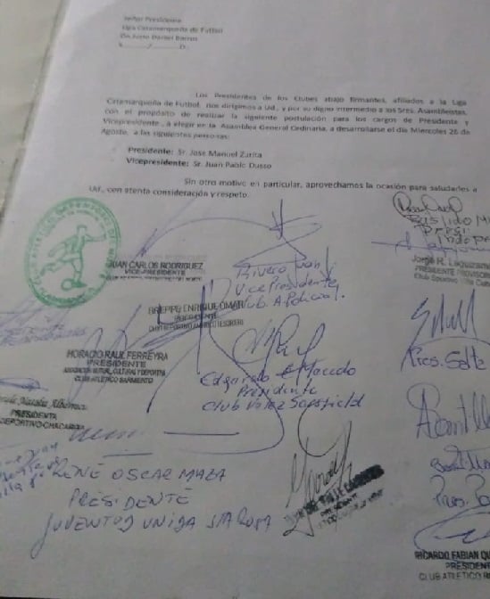 A todo esto, la nota presentada y leída en la oportunidad señala que “Los presidentes de los clubes afiliados a la Liga Catamarqueña, abajo firmantes, nos dirigimos a Ud. (por el presidente de la Liga Catamarqueña), y por su intermedio a los Sres. Asambleístas, con el propósito de realizar la siguiente postulación para los cargos de Presidente y Vicepresidente, a elegir en la Asamblea General Ordinaria a desarrollarse el día miércoles 26 de agosto, a las siguientes personas: