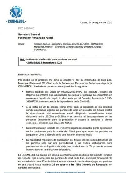 Además, indicó que Binacional deberá indicar en cuál estadio capitalino jugará antes de las 12 horas de Paraguay de este martes 25 de agosto. Y si no lo hace, lo determinará directamente Conmebol.