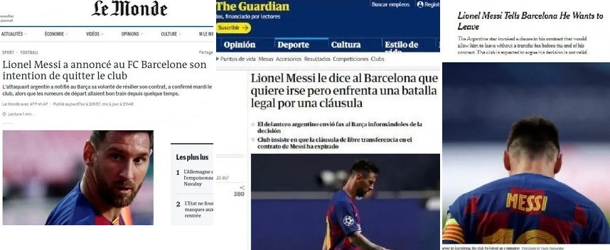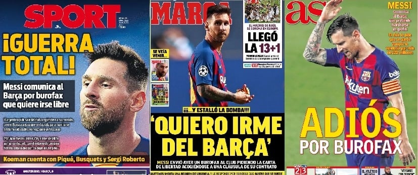 En España, Sport eligió contar desde el lado del famoso "burofax", un documento tipo faxcon valor legal, y tituló "¡Guerra total! Messi comunica al Barsa por burofax que quiere irse libre", así como "As", que expuso: "Adiós por burofax", mientras que "Marca" fue por una cita, "'Quiero irme del Barsa'".