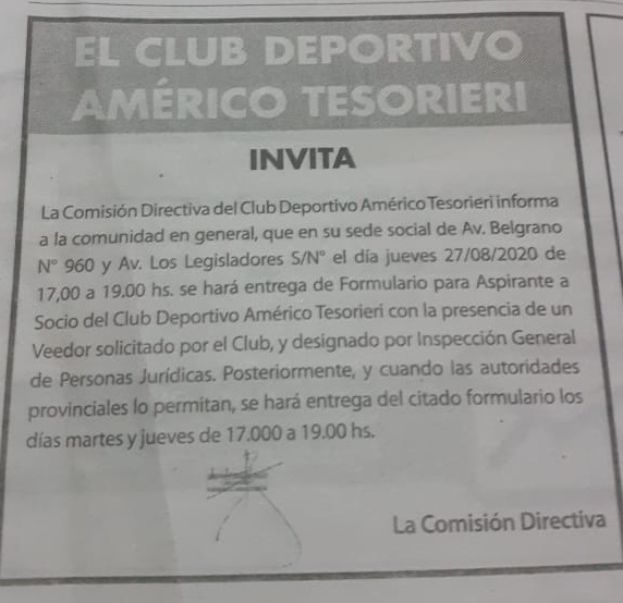 “La comisión directiva del Club Deportivo Américo Tesorieri informa a la comunidad en general que, en su sede social de Av. Belgrano Nro. 960 y Av. Los Legisladores s/n, el día jueves 27/08/2020, de 17 a 19 hs., se hará entrega de formularios para aspirantes a socio del Club Deportico Américo Tesorieri, con la presencia de un veedor solicitado por el Club, y designado por Inspección General de Personas Jurídicas.