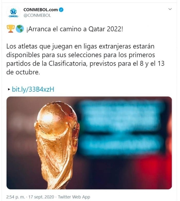 Tras varias semanas de incertidumbre y cuando parecía imposible que las Eliminatorias Sudamericanas para el Mundial de Qatar 2022 arrancaran el próximo mes, e incluso, durante 2020, entre la Conmebol y la FIFA llegaron a un acuerdo para que el certamen de selecciones que otorga cuatro cupos a la Copa del Mundo y uno para el repechaje, se inicie como estaba pactado, para evitar así que el formato deba ser modificado a causa de la falta de fechas. De esta manera, a partir de octubre empezarán a competir las selecciones sudamericanas por un lugar en el próximo Mundial.