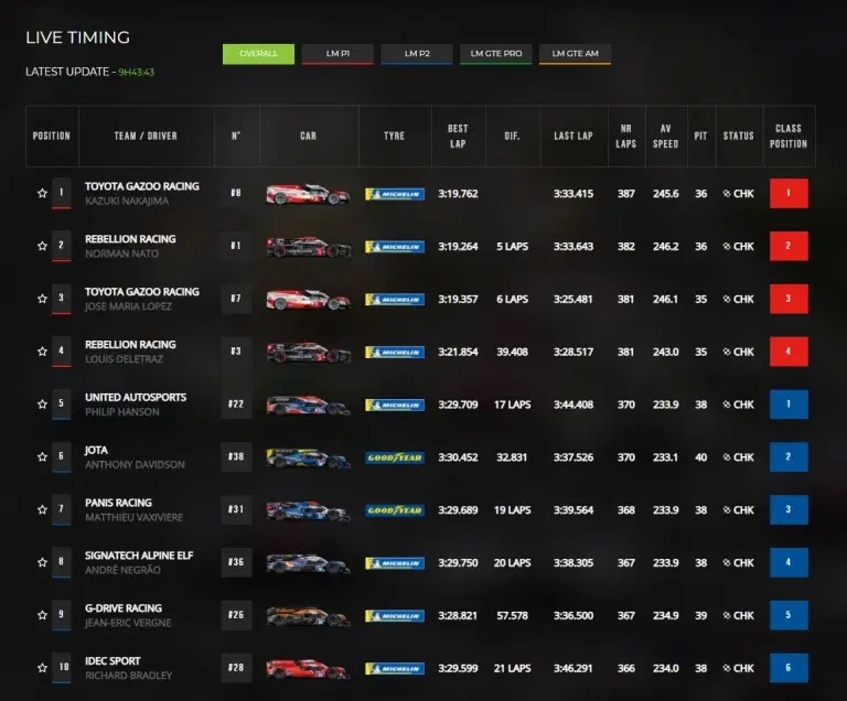 Koba volvió a la pista a siete vueltas del otro Toyota conducido por el suizo Sebastien Buemi, el también japonés Kazuki Nakajima y el neocelandés Brendon Hartley. Si bien completó su turno a un ritmo veloz, como luego también lo hicieron López y Conway, la diferencia fue imposible de descontar.