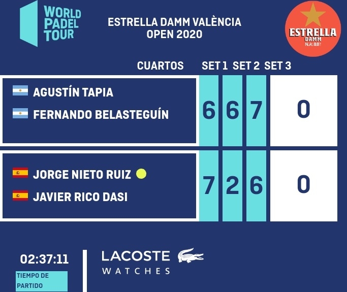 Sus rivales serán Fernando Belasteguín y Agustín Tapia, después de vencer a Coki Nieto y Javier Rico, en un auténtico partidazo que bien pudo ganar cualquiera de las parejas. Arrancaron mejor los españoles llevándose la primera manga por 7-6 pero en el segundo los argentinos igualaban la contienda con un 2-6. Un tie-break en el tercero marcaría la resolución del encuentro, cayendo del lado de la pareja número 4.