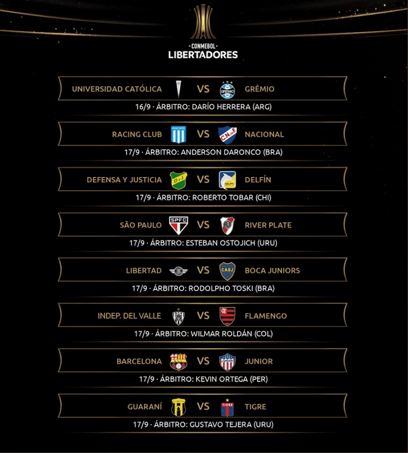 Racing-Nacional será dirigido por el brasileño Anderson Daroco, mientras que en Defensa-Delfín estará el chileno Roberto Tobar y el juez en Guaraní-Tigre será el uruguayo Gustavo Tejera.