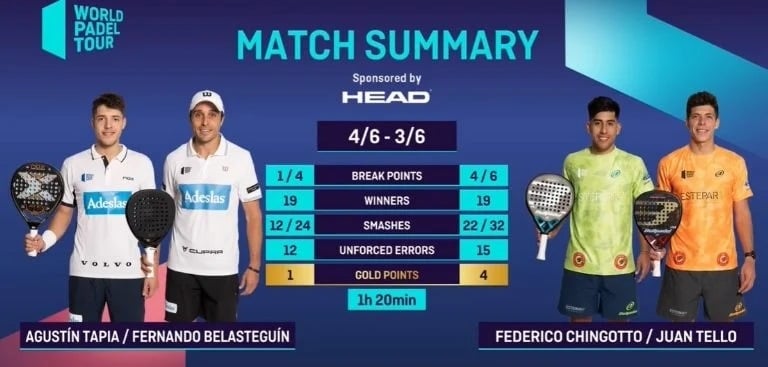 A todo esto, Chingotto y Tello eliminaron hoy con contundencia a Fernando Belasteguín y Agustín Tapia (6-4, 6-3), por lo que pelearán por su primera victoria. Los primeros se vieron favorecidos por su descanso en el cruce de cuartos, donde ni siquiera debieron saltar a la pista por la lesión de Pablo Lima, que no pudo formar binomio con Paquito Navarro.
