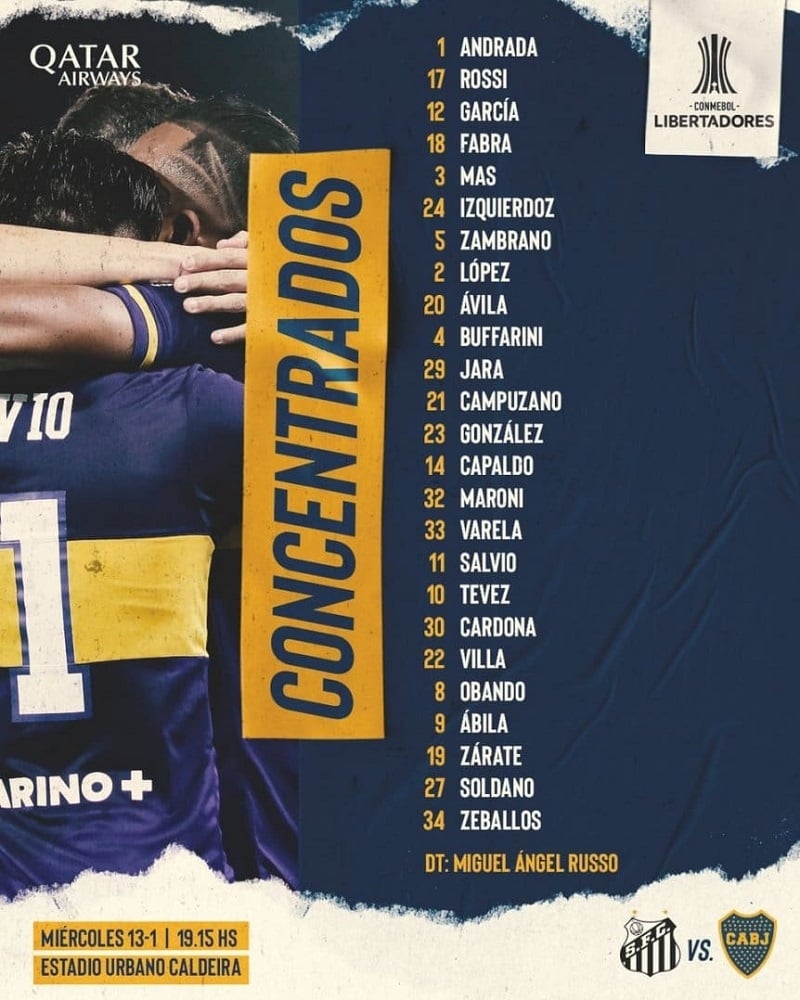 Boca visitará a Santos el miércoles, desde las 19.30, y Miguel Ángel Russo comenzó a diagramar el equipo, que saldría con Esteban Andrada; Leonardo Jara, Lisandro López, Carlos Izquierdoz, Frank Fabra; Jorman Campuzano, Nicolás Capaldo, Eduardo Salvio, Sebastián Villa; Carlos Tevez y Franco Soldano.