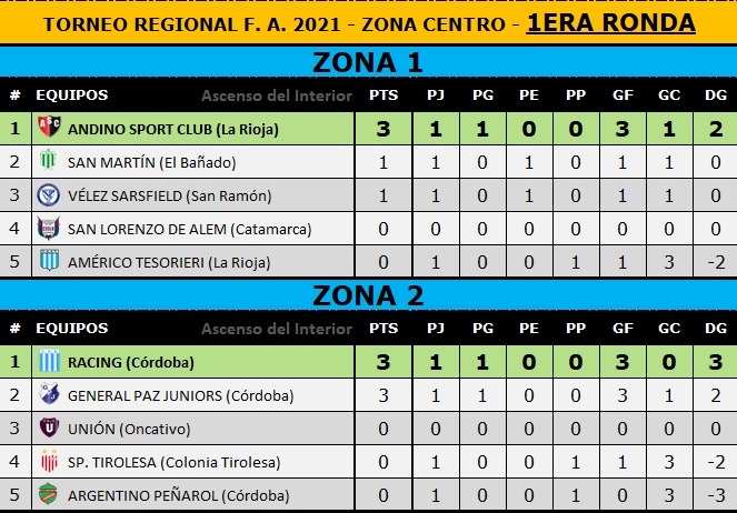 Las posiciones en la Zona 1: Andino 3 Pts.; San Martín y Véles 1; San Lorenzo de Alem y Tesorieri (LR) 0.