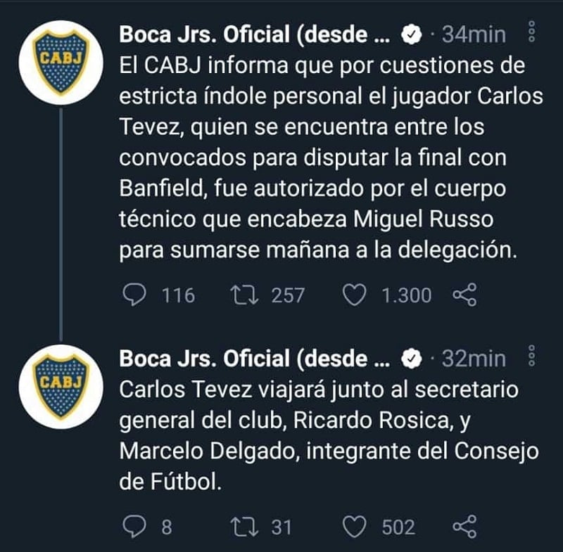 "El CABJ informa que, por cuestiones de estricta índole personal, el jugador Carlos Tevez, quien se encuentra entre los convocados para disputar la final con Banfield, fue autorizado por el cuerpo técnico que encabeza Miguel Russo para sumarse mañana (por el mismo domingo) a la delegación. Viajará junto al secretario general del club, Ricardo Rosica, y Marcelo Delgado, integrante del Consejo de Fútbol", anunció el Xeneize en las redes sociales.