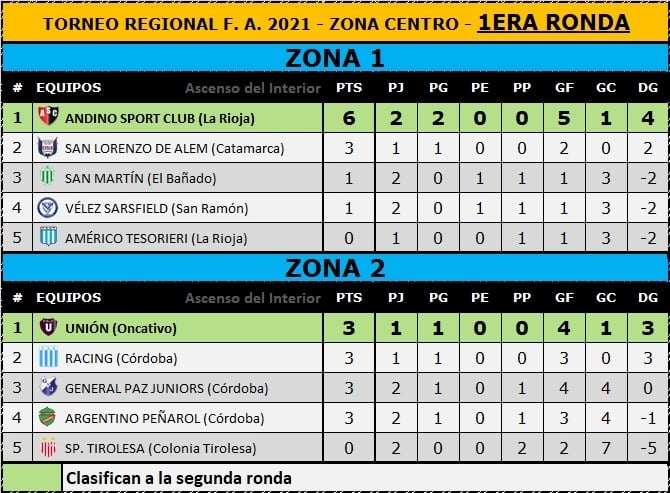 Actuales posiciones: Unión de Oncativo, Racing, Gral. Paz Juniors y Argentino Peñarol 3 Pts.; Sp. Colonia Tirolesa 0.