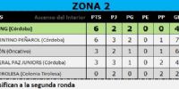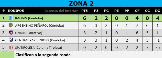 Posiciones Zona 2: Racing 6 (+4), Peñarol 6 (+1), Unión de Oncativo 3 (1), Gral. Paz Juniors 3 (-1) y Sp- Tirolesa 0 (-5).