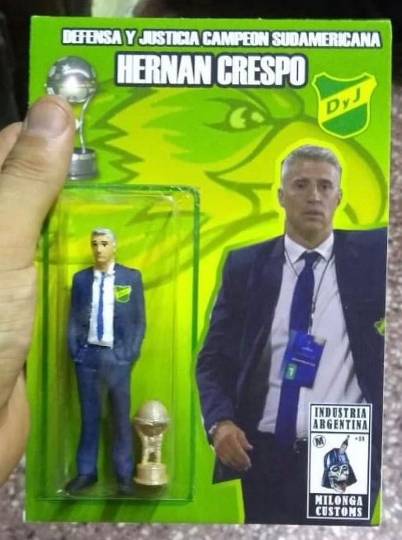 Luego de que Florencio Varela se bordara su primera estrella en el escudo, a una mente brillante se le ocurrió la idea de hacer un juguete de Valdanito. Y así fue como Milonga Customs, reconocidos por fabricar figuras de diferentes temáticas, puso manos a la obra y sacó a la venta a un mini Crespo, con su típico traje con el escudo del Halcón, corbata azul y hasta con la Copa.