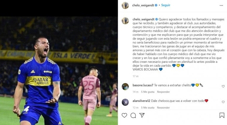 "Quiero agradecer todos los llamados y mensajes que he recibido y también agradecer al club, sus autoridades, cuerpo técnico y compañeros y destacar el acompañamiento del departamento médico, que me dio atención, dedicación y contención. Me explicaron que, de seguir jugando con esta lesión, se podía empeorar el cuadro y no sería beneficioso para nadie. En un primer momento al sentirme bien, me traicionaron las ganas de jugar en el equipo de mis amores y pensé más con el corazón que con la cabeza. Hoy, después de haber hablado con el cuerpo médico del club que me vio crecer y en los que confío plenamente voy a someterme a lo que ellos crean necesario para volver en plenitud lo antes posible a dejar la vida en cada partido. ¡Vamos Boca!"