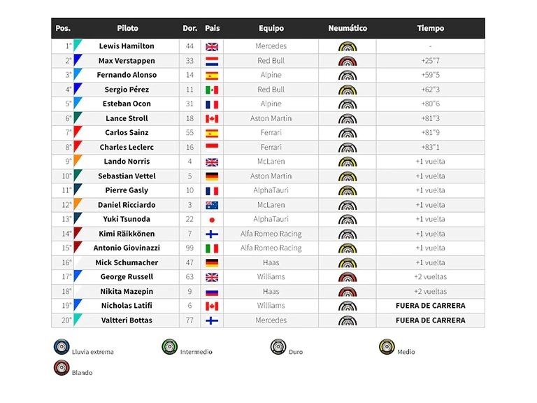 Pero el triunfo fue para Hamilton que alcanzó su séptima victoria en la temporada y achicó la diferencia con Verstappen a ocho puntos. En tanto que Alonso completó el podio luego de hacer una gran tarea luego de hacer solo una parada.