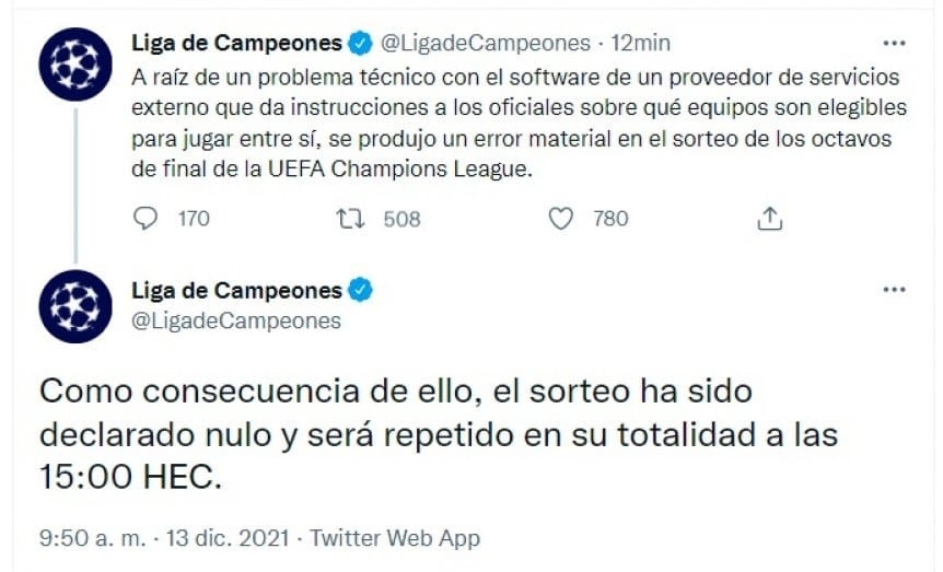 "A raíz de un problema técnico con el software de un proveedor de servicios externo que da instrucciones a los oficiales sobre qué equipos son elegibles para jugar entre sí, se produjo un error material en el sorteo de los octavos de final de la UEFA Champions League. Como consecuencia de ello, el sorteo ha sido declarado nulo y será repetido en su totalidad a las 15:00 (horario europeo, que son las 11 de Argentina)", informó la UEFA en twitter.