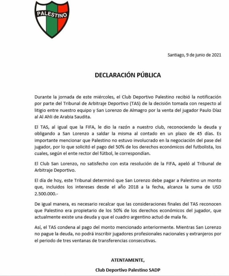 Otro de los conflictos que tiene San Lorenzo es por Paulo Díaz, debido a que todavía tiene una deuda importante con Palestino que incluso llegó al TAS.