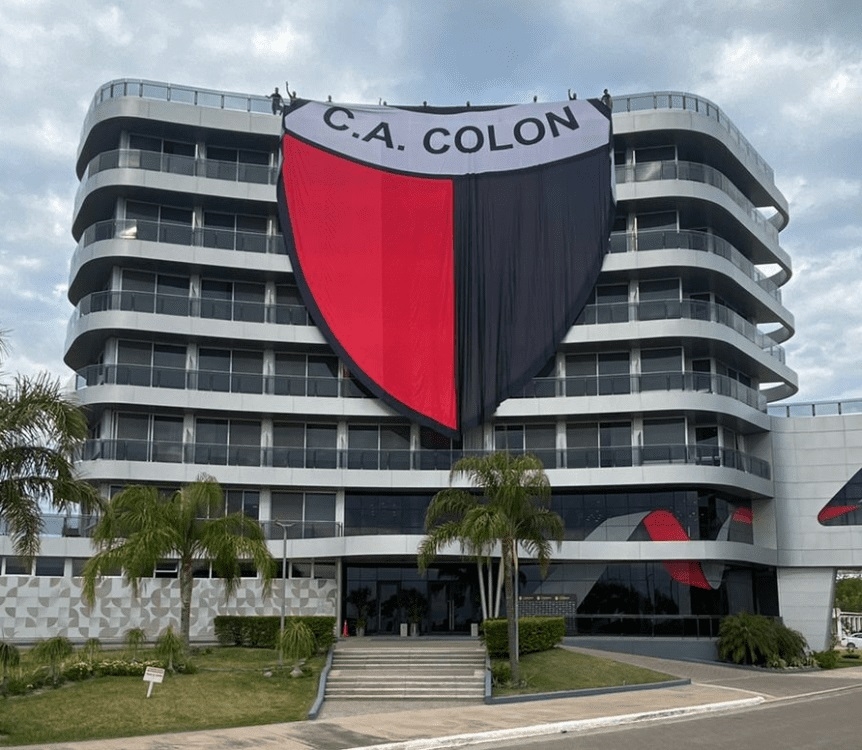 ¡Imponente! A la espera del duelo ante River por el Trofeo de Campeones, una enorme bandera con el escudo de Colón fue colgada en el lugar donde se alojan ambos planteles.