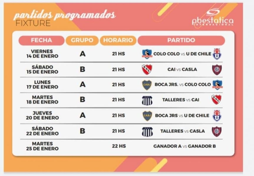 La disposición del mini-campeonato serán dos grupos de tres equipos en cada uno de ellos, es decir, dos triangulares. El Grupo A está encabezado por Boca, quien se medirá ante los conjuntos chilenos. Por el Grupo B, Independiente, San Lorenzo y Talleres jugarán entre sí y gracias a eso habrá con seguridad un equipo de Argentina en la final.