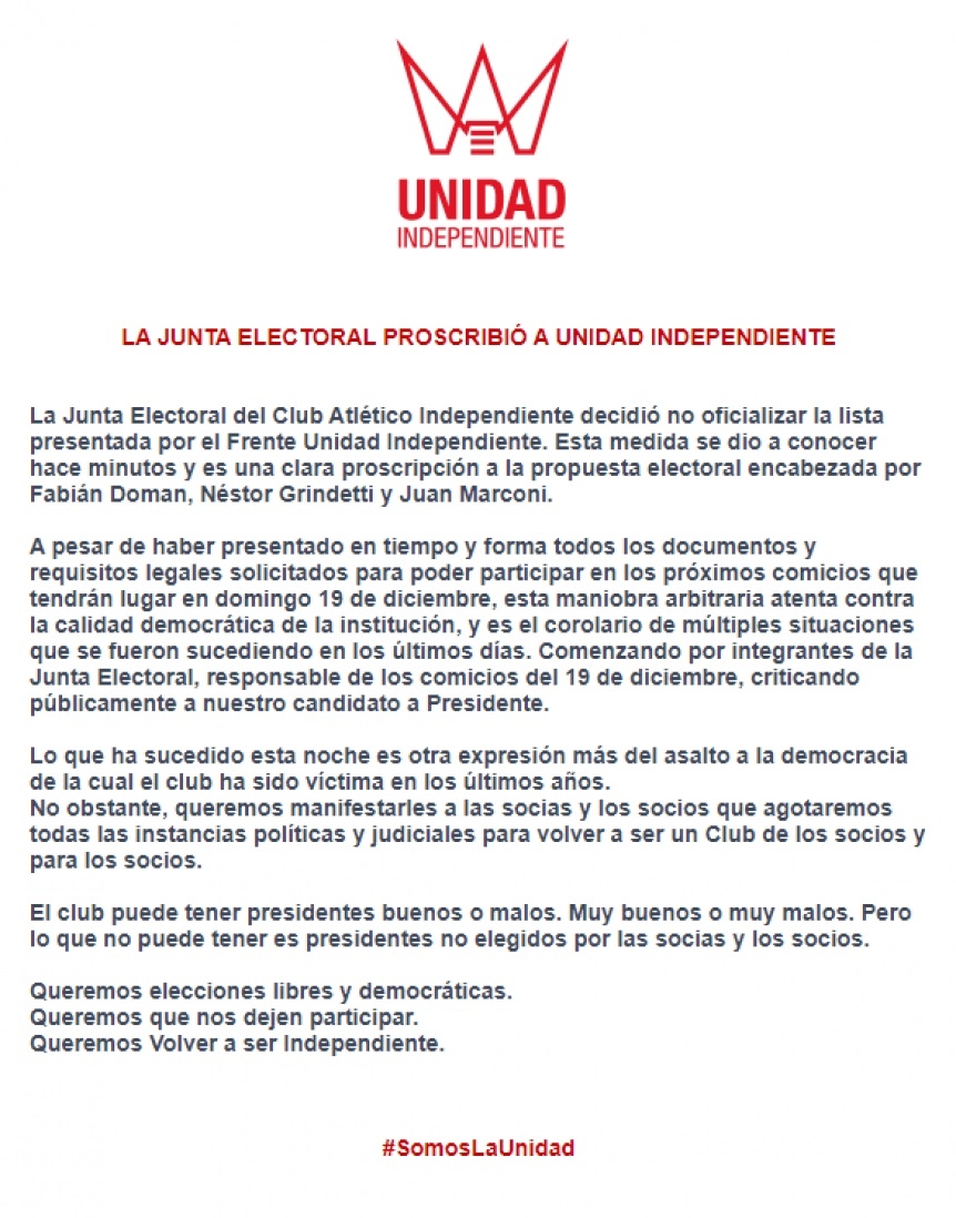 "Esta maniobra arbitraria atenta contra la calidad democrática de la institución y es el corolario de múltiples situaciones que se fueron sucediendo en los últimos días", comunicaron desde Unidad Independiente, minutos después de oficializarse la impugnación de su lista por parte de la Junta Electoral.