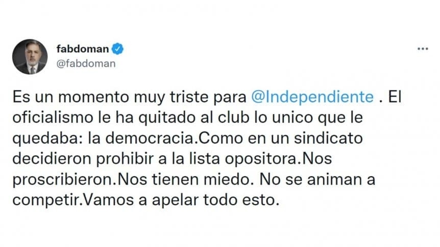 "Es un momento muy triste para Independiente. El oficialismo le ha quitado al club lo único que le quedaba: la democracia. Como en un sindicato decidieron prohibir a la lista opositora. Nos proscribieron. Nos tienen miedo. No se animan a competir. Vamos a apelar todo esto", disparó.
