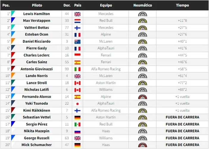 El triunfo quedó para Hamilton que alcanzó su octava victoria en la temporada y quedó a una de Verstappen. El campeonato se decidirá en Abu Dhabi en una semana en el Circuito de Yas Marina y el que gane será campeón mundial. Caso contrario, si ninguno de ellos suma puntos, el campeón será Verstappen