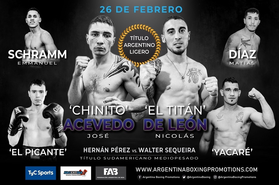 El campeón argentino y sudamericano ligero, el invicto santiagueño José “Chinito” Acevedo, se enfrentará al ascendente bonaerense Nicolás “El Titán” De León, intentando defender por tercera ocasión su corona argentina, en uno de los combates estelares de la velada que se desarrollará este viernes, 26 de febrero, en el Microestadio Municipal de Hurlingham, provincia de Buenos Aires, Argentina, en una nueva producción de Argentina Boxing Promotions, de Mario Margossian, que será transmitida en vivo a través de TyC Sports a partir de las 21:30, para Argentina y toda América.
