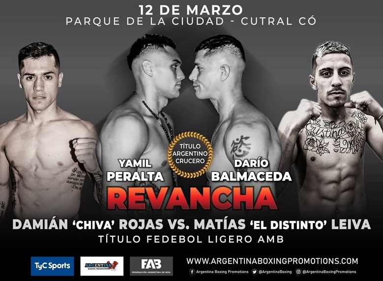 Una explosiva noche se acerca, con atrapantes choques, importantes campeones y promisorios prospectos, de la mano de Argentina Boxing Promotions por TyC Sports. El campeón sudamericano y latino crucero del Consejo Mundial de Boxeo (CMB), el doble olímpico e invicto bonaerense Yamil Peralta, se enfrentará al monarca argentino crucero, el cordobés Darío Balmaceda, quien buscará defender por primera ocasión su corona argentina, en un esperado duelo revancha, en uno de los combates estelares de la velada que se desarrollará este viernes, 12 de marzo, en el Parque de la Ciudad, de Cutral Có, Neuquén, Argentina, en una nueva producción de Argentina Boxing Promotions, de Mario Margossian, que será transmitida en vivo a través de TyC Sports a partir de las 22, para Argentina y toda América.