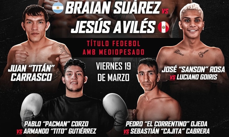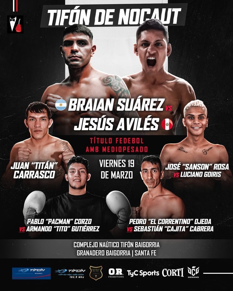 La velada, bautizada “Tifón de Nocaut”, será televisada por Tyc Sports y tendrá otros combates profesionales como el plato fuerte entre el argentino Braian Suárez y el peruano Jesús Avilés que disputarán el título Fedebol AMB Mediopesado.