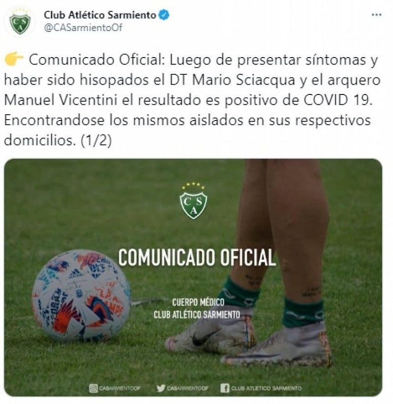 Sarmiento, de Junín comunicó este jueves otros nueve casos de coronavirus entre los jugadores y el cuerpo técnico, que se perderán el partido del domingo ante Defensa y Justicia, por la sexta fecha de la Zona 2 de la Copa de la Liga Profesional.