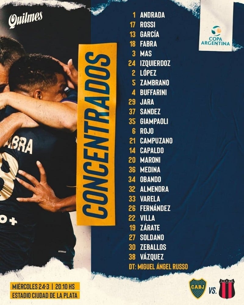 El equipo sería con: Agustín Rossi, Julio Buffarini, Carlos Zambrano, Marcos Rojo, Emmanuel Mas; Ezequiel Zeballos, Alan Varela, Agustín Almendra, Agustín Obando; Mauro Zárate y Franco Soldano.