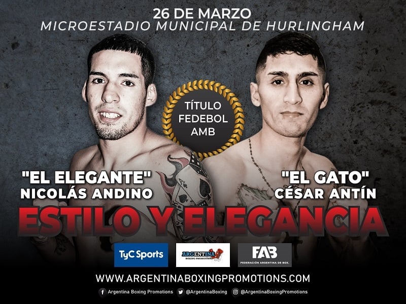 El estilista bonaerense Nicolás “El Elegante” Andino se enfrentará al rionegrino César “El Gato” Antín, intentando conquistar el título fedebol welter de la Asociación Mundial de Boxeo (AMB), que se encuentra vacante.