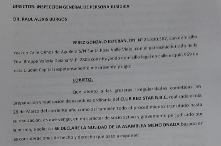 La presentación de Pérez fue hecha ante la Inspección General de Personas Jurídicas (IGPJ), con el patrocinio de la abogada Valeria Daiana Breppe, en su “carácter de socio activo y gravemente perjudicado”, exponiendo los hechos que motivan su agravio, y considerando que “fue todo muy irrisorio y muy sucio lo que hicieron”, según expresó en una posterior entrevista que brindó al programa deportivo “Botineros Diario” de radio Valle Viejo.