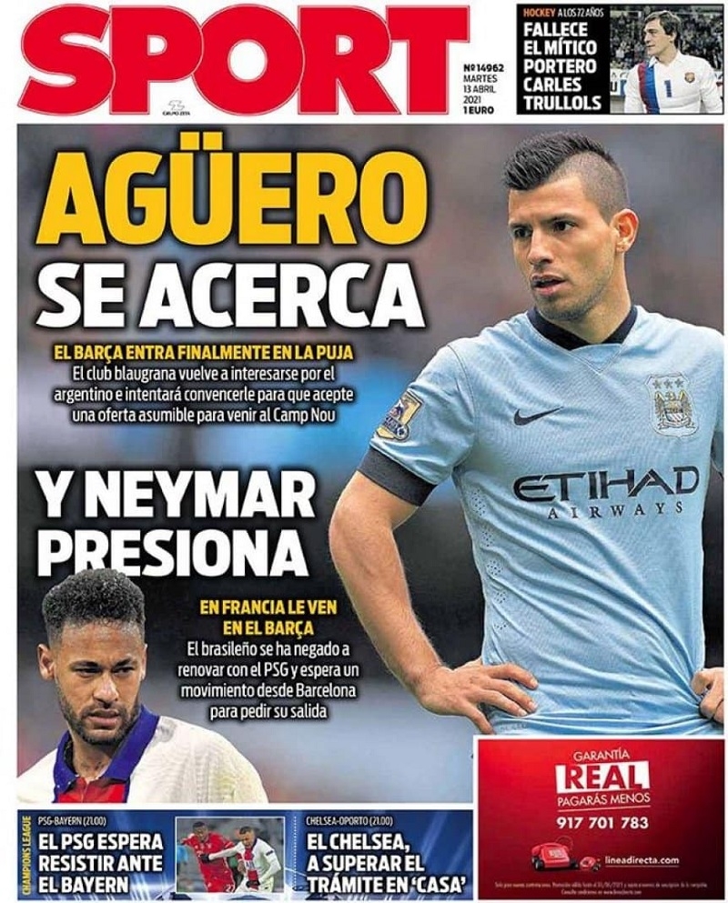 En marzo, TyC Sports señalaba que Barcelona le había realizado una oferta formal al Kun para que juegue junto a Lionel Messi en Barcelona y la tapa del Sport de hoy asegura “Agüero se acerca”.