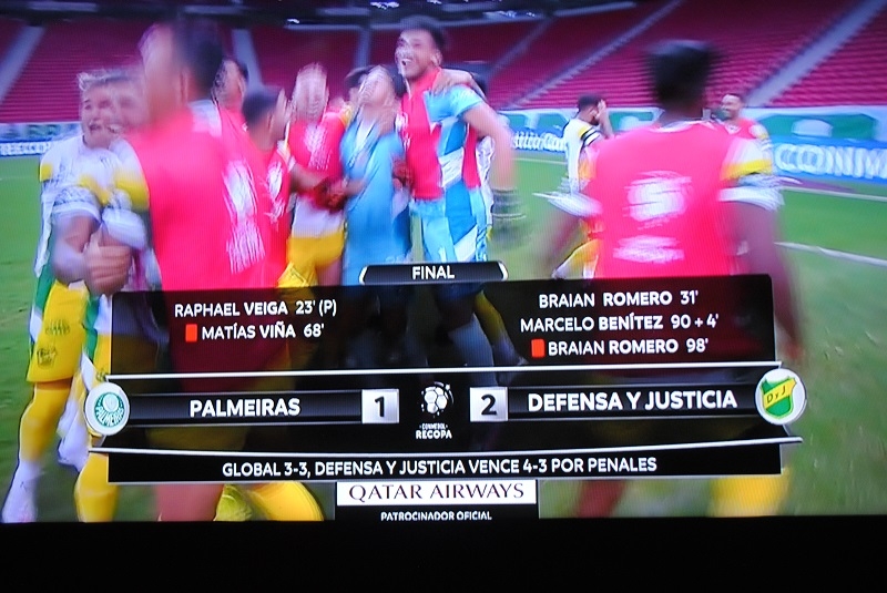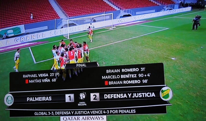Defensa y Justicia revirtió el 1-2 padecido en la ida en Florencio Varela del miércoles pasado, con un similar 2-1 en su visita a Palmeiras por la revancha de la Recopa Sudamericana.
